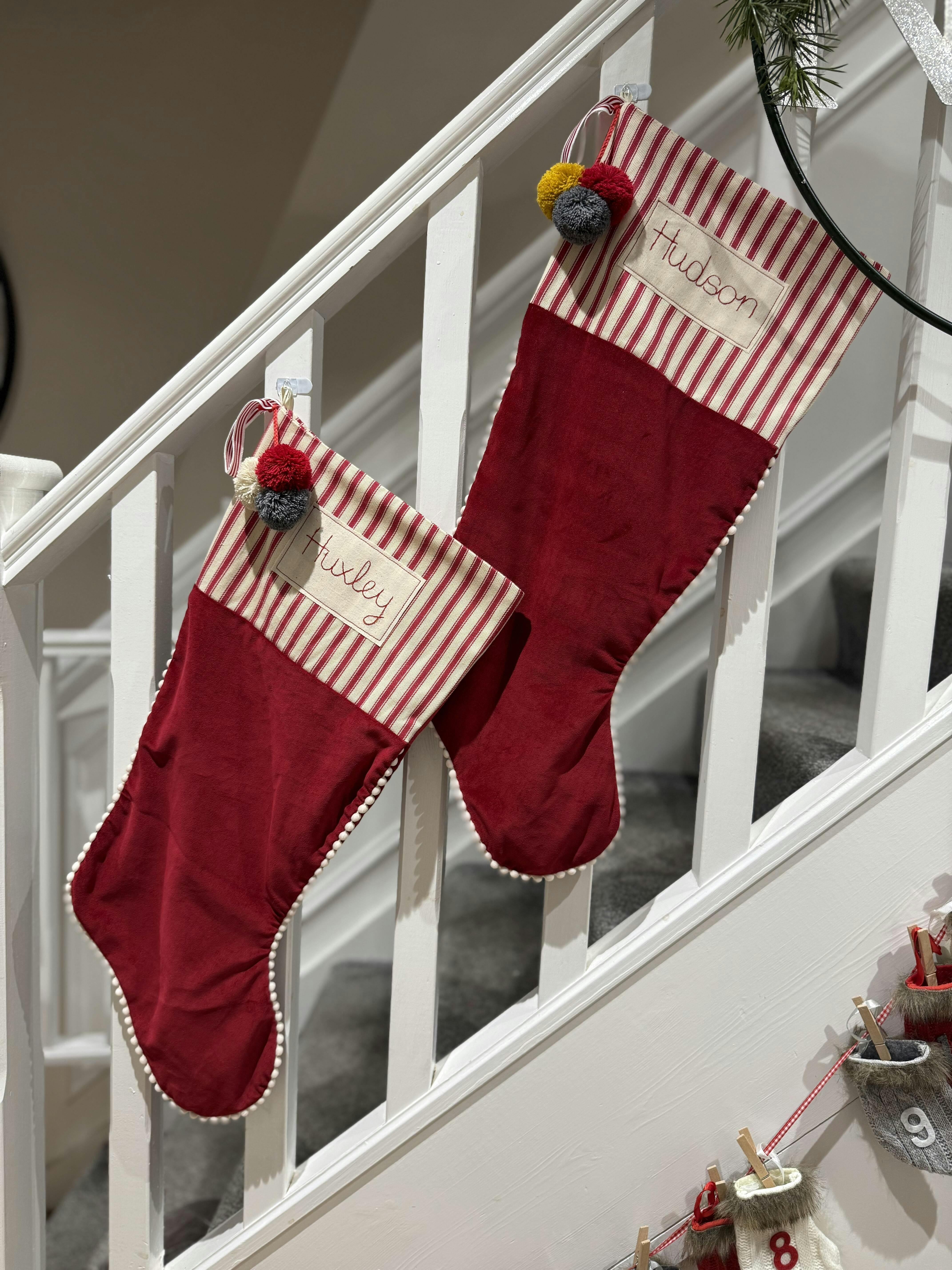 Each personalised velvet Christmas Stocking is available in red, emerald green, winter white, purple, mustard, teal and pink pearl velvet. The red stocking comes with a red ticking cuff and the pink, mustard, teal, green, purple and winter white comes with a grey ticking cuff. Each stocking comes with mini pom pom trim and is lined in cotton poplin. Finally your stocking is finished off with 3 handmade colourful pom poms to compliment your chosen stocking colour.